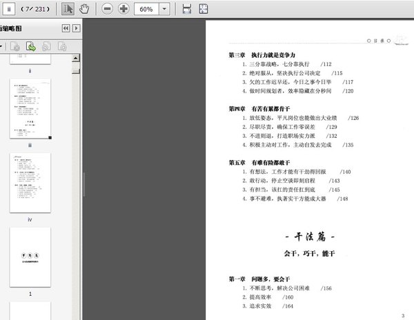 : 梦想篇 公司是我圆梦的舞台 第一章 我是梦想派 1.人生不能没有梦想支撑 2.有梦想的员工办法多 3.相信自己,信任公司 4.为梦想持之以恒 第二章 做个有追求的员工 1.干一行,爱一行 2.更专业,更精通 3.逼自己一把 4.为选择而坚持 第三章 团队的梦,我的梦,同一个梦 1.大局思想:把团队利益摆在第一位 2.与团队同荣辱,共进退 3.心系团队,朝三暮四要不得 4.像老板一样思考,团队的问题就是我的问题 5.工作没有分内分外,积极主动向梦想进发 6.团队精神促发展,单枪匹马难成事 7.忠诚才有未来 第四章 实干成就梦想 1.脚踏实地为梦想工作 2.实干是优良的传统 3.实干才能被信任 4.实干推动事业发展 5.实干赢得上司支持 实干篇 肯干,敢干,快干 第一章 成大事,从做小事干实事开始 1.做事不贪大,金字塔也是石块垒出来的 2.拒绝浮躁,差之毫厘就会谬以千里 3.尽职尽责,小事方能体现真功夫 4.见微知著,成也细节败也细节 5.做细做精,活在责任和义务里 第二章 我是实干派 1.用心思 2.有劲头 3.讲方法 4.重开拓 5.促发展 第三章 执行力就是竞争力 1.三分靠战略,七分靠执行 2.绝对服从,坚决执行公司决定 3.欠的工作迟早还,今日之事今日毕 4.做时间规划者,效率隐藏在分秒间 第四章 有苦有累都肯干 1.放低姿态,平凡岗位也能做出大业绩 2.尽职尽责,确保工作零误差 3.不进则退,打造职场实力派 4.积极主动对工作,主动自发去完成 第五章 有难有险都敢干 1.有想法,工作才能有干劲得回报 2.敢行动,停止空谈即刻启程 3.有担当,该扛的责任扛到底 4.事不避难,执著实干方能成大器 干法篇 会干,巧干,能干 第一章 问题多,要会干 1.不断思考,解决公司困难 2.提高效率 3.追求实效 第二章 一定要干好,我学会巧干 1.好方法才能做好事 2.拓思路,寻路子 3.提前准备,方案不止一套 4.转变思路,四两也能拨千斤 5.妙招巧干能成功,埋头瞎干死胡同 第三章 工作方法,实干巧干的制胜法宝 1.一流员工找方法,末流员工找理由 2.巧干胜过蛮干,执行也讲求方法 3.思路决定出路,走出固步自封的圈子 4.提高工作效率,简化问题找关键 5.你的好点子,企业很需要 第四章 不落后,要超越,才叫能干 1.勇于创新,敢走“别人没走过的路” 2.将创新融入工作,积极为企业出谋划策 3.勇于打破常规,就能超越平庸 4.只要敢想,创意就能出现 5.不留死角,解决问题要彻底 6.带着创造力去工作 7.换一种思想,海阔天空
