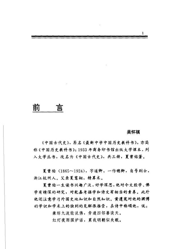 : 夏曾佑 1865-1924 《中国古代史》(《最新中学中国历史教科书》) 孟 森 1868-1937 《明清史论著集刊正续编》 梁启超 1873-1929 《中国历史研究法》 《清代学术概论》 王国维 1877-1927 《观堂集林》 陈 垣 1880-1971 《明季滇黔佛教考》 岑仲勉 1886-1961 《隋唐史》 金毓黻 1887-1962 《中国史学史》 李大钊 1889-1927 《史学要论》 胡 适 1891-1962 《中国哲学史大纲》 郭沫若 1892-1978 《中国古代社会研究》 《青铜时代》《十批判书》《甲申三百年祭》 顾颉刚 1893-1980 《古史辨自序》 范文谰 1893-1969 《中国通史简编》 钱 穆 1895-1990 《先秦诸子系年》 傅斯年 1896-1950 《民族与古代中国史》 李 济 1896-1979 《安阳》 翦伯赞 1898-1968 《历史哲学教程》 周谷城 1898-1996 《世界通史》 吕振羽 1900-1980 《史前期中国社会研究》 向 达 1900-1966 《唐代长安与西域文明》 侯外庐 1903-1987 《中国古代社会史论》 韩儒林 1903-1983 《穷庐集》 尚 钺 1902-1982 《中国历史纲要》 齐思和 1900-1980 《中国史探研》 邓广铭 1907-1998 《北宋政治改革家王安石》 吴 晗 1909-1969 《朱元璋传》 白寿彝 1909-2000 《民族宗教论集》 邵循正 1909-1973 《中法越南关系史末》 夏 鼐 1910-1985 《考古学论文集》 谭其骧 1911-1992 《长水粹编》 唐长孺 1911-1994 《魏晋南北朝史论丛》 陈梦家 1911-1966 《尚书通论》 胡厚宣 1911-1995 《甲骨学商史论丛初集》