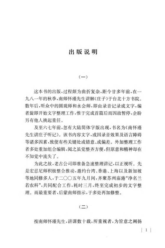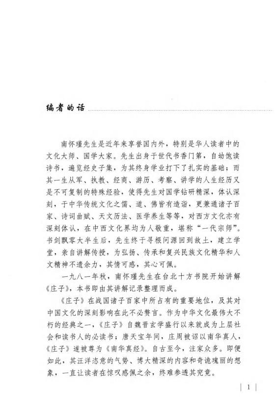 南怀瑾先生青年时期即遍研诸子百家之学,自立之年,又深入经藏道法,历经多年身体力行实证,深得《庄子》精华。上世纪八十年代初,南先生讲解《庄子》于台北十方书院,游乎经史子集,博征佛道乃至西方宗教学术观点,阐扬《庄子》之宗旨大义,清晰明白,通俗生动,精义迭出。据南先生的讲解录音整理成书的《庄子諵哗》是现代读者阅读、理解《庄子》的最好读本。