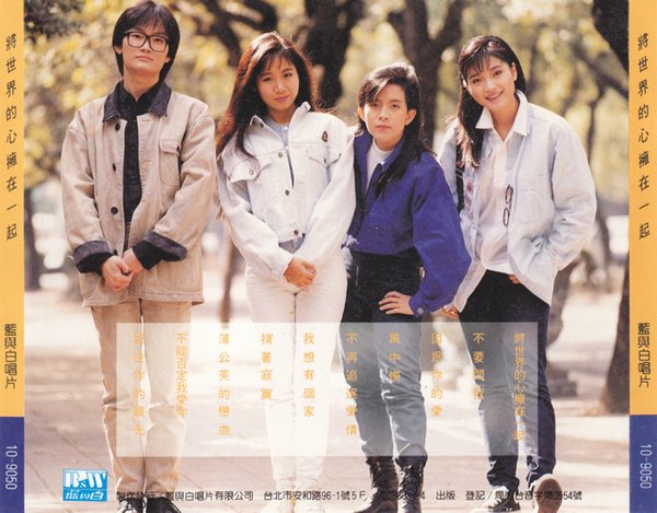 《将世界的心拥在一起》是蓝与白唱片群星出版的第一张合辑,之后出版了串烧合辑《重力加速度》及《蓝白TOP招牌歌1 、2》、《蓝白TV原声带1、2》、《蓝白LOVE抒情歌1、2》、《纪录片1、2》、《摘下面具与我共舞》、《1992抒情金曲精选最爱的歌》、《好歌入档》数张合辑。