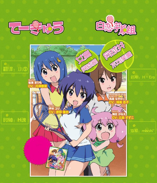 由 ルーツ原作、Piyo绘制的漫画作品「网球」,在第1卷的单行本中公开了TV动画化的消息。作品主要是围绕着龟井户高校网球部的四个女生展开的滑稽搞笑日 常生活。在被愚笨的前辈们折腾的途中变成了吐槽立场的后辈押本百合,明明是网球部的一员却完全不会打网球的笨蛋二年级学生新庄佳苗,完全无法预料的关西风 大变态的二年级学生板东藻,不管什么都用金钱来解决的、充满谜团的天然大小姐高宫茄子。这是一部她们四人不管聚集也好还是不聚集也好都会引来爆笑的网球漫 画?!虽然说是网球相关的作品,但是作品的内容却基本完全不涉及网球。这部漫画连载时间不过5个月,没想到竟然如此之快的宣告TV动画化,还是在今年10 月开播,这个速度简直快得难以置信。