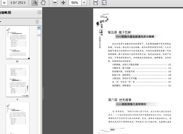 : 第一章准确定位——选择最适合自已的路正确认识自己目标是你前进路上的灯塔拒绝盲目,找准位置适合自己的才是最好的守好目标,守护理想你为自己定好位了吗明确目标,有条不紊脚踏实地,切莫好高骛远第二章把握命运——自信笃行,成竹在胸信心是迈向成功的第一步相信自己可以做到自卑是人们冲向成功的发动机超越自卑,完善自己别害怕,行动起来唤醒身体内的潜能战胜自己,战胜命运认真走好人生每一步第三章淡定沉稳——千里之行始于足下欲成大事,力戒浮躁三思而行,冲动是魔鬼不积跬步,无以至千里善于忍耐,能屈能伸适当示弱,稳中取胜淡定沉稳,小心谨慎循序渐进,欲速则不达冷静思考,淡定从容第四章高瞻远瞩——思想有多远你就能走多远有志者,事竟成做人要有野心思想有多远,你就能走多远放远眼光,俯瞰世界机会只留给有准备的人第五章敢于创新——羊肠小道也能通向成功巅峰大胆创新,走别人不敢走的路不断思考,敢于创新没有做不到,只有想不到标新立异,独特领先大胆尝试,没有什么不可能从“无”中生出“有”来独辟蹊径,剧样成功第六章世无难事——相信困难只是眼前的正视困难,排除万险挫折是成功的垫脚石心态决定你的成败乐观面对人生的挫折屡败屡战,跌倒后再爬起来笑看成败,从头再来不经历风雨,怎么见彩虹第七章勇担责任——肩挑大担无双好汉生命因责任而精彩责任成就优秀人生恪尽职守,热爱你的工作完善责任,超越能力没有借口,勇于认错诚信,也是一种责任第八章路在脚下——坚持就一定能够成功坚持不懈,人贵有恒坚持下去,莫管他人眼光心存希望,永不言弃水滴石穿,功在坚持驽马十驾,功在不舍成功从信念开始成功就在下一秒