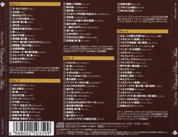 01. Bach, J. S. - Jesu bleibet meine Freude, BWV. 147-10 - Tatyana Nikolayeva 02. Bach, J. S. - Menuett in G Major - Gabriel Chodos 03. Bach, J. S. - Italienisches Konzert, BWV. 971-1 Satz - Ewa Poblocka 04. Bach, J. S. (arr. F. Galston) - Sicilienne, BWV. 1031 - Ewa Poblocka 05. Bach, J. S. - Toccata in E Minor - Ewa Poblocka 06. Bach, J. S. - Menuett, BWV. Anh. 116 - Ritsuko Kobata 07. Bach, J. S. - Prelude, BWV. 846-1 - Ritsuko Kobata 08. Bach, C. P. E. - Solfogietto - Ritsuko Kobata 09. Bach, C. P. E. - Fantasia, Wq. 117-12 - Ritsuko Kobata 10. Handel - The Harmonious Blacksmith - Cornelia Herrmann 11. Daquin - Le coucou - Ritsuko Kobata 12. Couperin - Les petits moulins a vent - Ritsuko Kobata 13. Couperin - Le reveil-matin - Ritsuko Kobata 14. Rameua - La poule - Ritsuko Kobata 15. Haydn - Menuett in C Major - Ritsuko Kobata 16. Haydn - Piano Sonata No. 23 in F Major, 2nd Mov. - Stanislav Bunin 17. Mozart - Rondo- Alla Turca - Kemal Gekic 18. Mozart - Menuett, K. 355 - Eric Heidsieck 19. Beethoven - Piano Sonata No. 14 'Moonlight', 1st Mov. - Yuko Nakamichi 20. Beethoven - Fur Elise, WoO. 59 - Cornelia Herrmann 21. Beethoven - Menuett in G Major - Gabriel Chodos 22. Diabelli - Introduction and Rondo, Op. 151-4 - Ritsuko Kobata