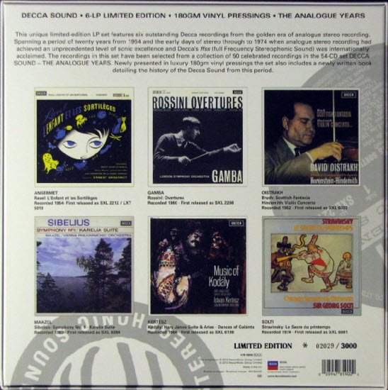 This unique Limited Edition LP set features six outstanding Decca recordings from the golden era of analogue stero recording. Spanning a period of twenty years from 1954 and the early days of stereo through to 1974 when analogue stereo recording had achieved an unprecedented level of sonic excellence and Decca's ffss (Full Frequency Stereophonic Sound) was internationally acclaimed. The recordings in this set have been selected from a collection of 50 celebrated recordigns in the 54-CD set Decca Sound - The Analogue Years. Newly presented in luxury 180 gram vinyl pressings the set also includes a newly written book detailing the history of the Decca Sound from this period.
