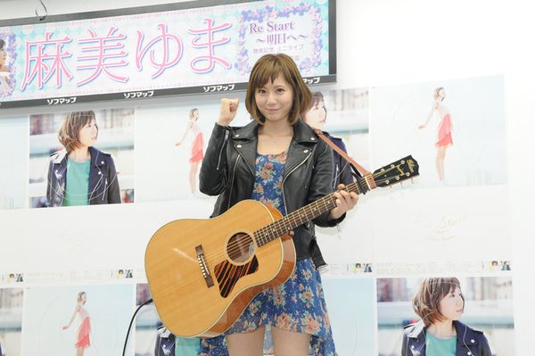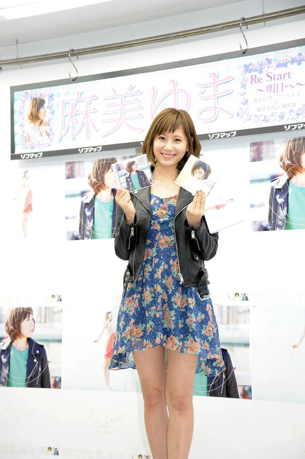 麻美ゆ于5月20日发行自己的出道单曲[Re Start~明日へ~],在单曲发行的当天麻美ゆま在秋叶原举办了自己新单[Re Start~明日へ~]的记者见面会,麻美2012年发现罹患卵巢癌,隔年2月接受手术将子宫全部摘除,在经历了和病魔抗争后她再次回归,在当天现场当麻美听到气志团成员綾小路翔给她送上“Re Start”祝福留言后当场留下了眼泪,目前当天现场的照片已经解禁公开。