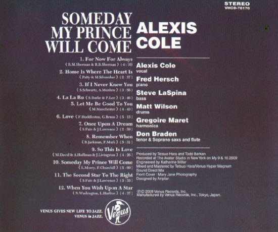 Such is the case of Alexis Cole's Someday My Prince Will Come, which features a collection of Disney tunes reread into a jazz format. Cole cleverly did not choose songs that might be too obvious, focusing mostly on more obscure numbers such as the opener, the beautiful "For Now For Always" (from The Parent Trap) and "Once Upon A Dream" (from Cinderella).