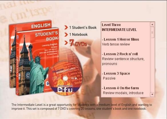 EFU - ENGLISH FOR INTERMEDIATE LEVELS - 20 VCD - 20 VCD, 1 Student?s Book, 1 Notebook ve 1 Dictionary... KONULAR 1-Horror Films 2-Rock N Roll 3-Space 4-On the farm 5-At the hospital 6-At the circus 7-At the beach 8-Crime doesn t pay 9-At the a musement park 10-At the grocey store 11-At the playground 12-Under the weather 13-At the hotel 14-Fairy Tales & Legends 15-Christmas time 16-In the workshop 17-At the camp 18-At the doctors 19-Review 1 Lessons 20-Review 2 Lessons
