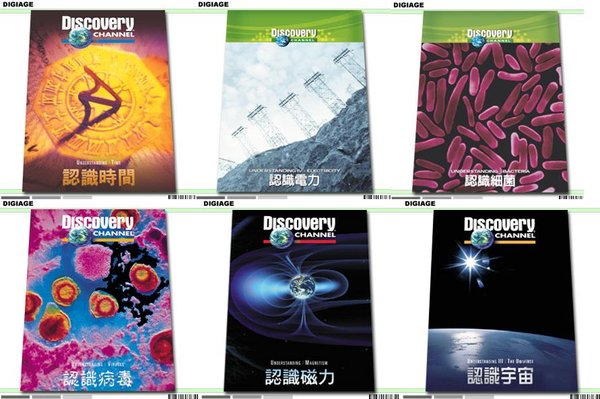 Discovery科学知识系列包括认识时间、认识电力、认识细菌、认识太空旅行、认识磁力、认识飞行、认识两性、认识宇宙、认识病毒。