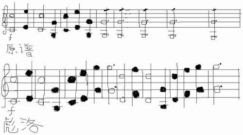 俺把这段谱子画出来了,如下,上面行是原谱,下面是彪洛的处理。