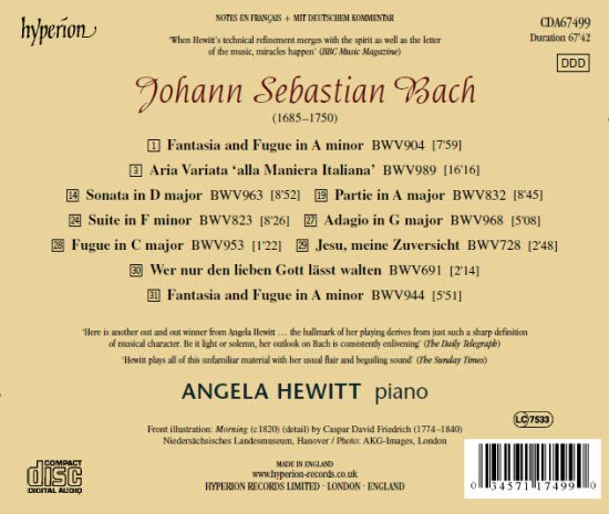 At the best of times under the best of circumstances, Glenn Gould was compelling, but the rest of the time, he was just nuts. Nope, when it comes to the question of who the greatest Canadian Bach pianist is, the answer is Angela Hewitt, just like when it comes to the question of who the great living Bach pianist is, the answer is Angela Hewitt. In her series of recordings of the keyboard works of Bach for Hyperion, Hewitt's brilliant virtuosity, lively intelligence, and deep musicianship have defined what it means to play Bach on the piano at the turn of the second millennium. Even in this the last volume of the series containing some of his least-known works, Hewitt is not playing "the last and the least" but, as she remarks in his notes, the best of the rest. While not the best known of Bach's works, they are, at least in Hewitt's hands, supreme works of musical craft and sublime works of spiritual beauty. From the pair of Fantasias and Fugues in A minor that open and close the program through the dolorous Variations alla Maniera Italiana to the exquisite pair of chorale preludes, Hewitt has assembled her program with taste and sensitivity. Hewitt's performances here are as fine as those of the rest of her series, as serious, as witty, as virtuosic, as lucid, and as lovely as the rest of her Bach recordings. And Hyperion's sound captures Hewitt's performances in sound as clear and warm as the rest of their wonderful recordings.