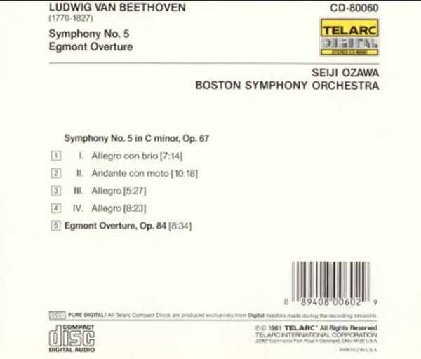Egmont, Op. 84, by Ludwig van Beethoven, is a set of incidental music pieces for the 1787 play of the same name by Johann Wolfgang von Goethe. It consists of an overture followed by a sequence of nine additional pieces for soprano, male narrator and full symphony orchestra. (The male narrator is optional; he is not used in the play, and he does not appear in all recordings of the complete incidental music.) Beethoven wrote it between October 1809 and June 1810, and it was premiered on 15 June 1810. The subject of the music and dramatic narrative is the life and heroism of a 16th-century Dutch nobleman, the Count of Egmont. It was composed during the period of the Napoleonic Wars, at a time when the French Empire had extended its domination over most of Europe. Beethoven had famously expressed his great outrage over Napoleon Bonaparte's decision to crown himself Emperor in 1804, furiously scratching out his name in the dedication of the Eroica Symphony. In the music for Egmont, Beethoven expressed his own political concerns through the exaltation of the heroic sacrifice of a man condemned to death for having taken a valiant stand against oppression. The Overture later became an unofficial anthem of the 1956 Hungarian revolution. Beethoven composed Klärchen's songs, "Die Trommel gerühret" ("The drum is a-stirring") and "Freudvoll und leidvoll" ("Joyful and woeful"), with the Austrian actress Antonie Adamberger specifically in mind. She would later repeatedly and enthusiastically recall her collaboration with him. The music was greeted with eulogistic praise, in particular by E.T.A. Hoffmann for its poetry, and Goethe himself declared that Beethoven had expressed his intentions with "a remarkable genius". The overture, powerful and expressive, is one of the last works of his middle period; it has become as famous a composition as the Coriolan Overture, and is in a similar style to the Fifth Symphony, which he had completed two years earlier. This TELARC EDITION: Recorded in Symphony Hall, Boston, January 24 and 26, 1981 Microphones: Schoeps Colette Series Recorder: Soundstream Digital Tape Recorder Console: Neotek Monitor Speakers: ADS Model 1530 bi-amplified, ADS Model C2000 Crossover Power Amplifiers: Threshold Model 4000 Interconnecting Cables: Audio-Technica During the recording of the digital masters and the subsequent transfer to disc, the entire audio chain was transformerless. The signal was not passed through any processing device (i.e., compression, limiting, or equalization) at any step during production. Sampling frequency conversion of Telarc's Soundstream digital master to the Compact Disc format was accomplished with the Studer SFC-16 sampling frequency converter. The digital information was not subject to any analog intersteps, thus preserving the integrity of the original digital master. Art Direction -- Ray Kirschensteiner Composed By -- Ludwig van Beethoven Conductor -- Seiji Ozawa Engineer [Recording] -- Jack Renner Orchestra -- Boston Symphony Orchestra Photography By [Cover] -- Peter Schaaf (2) Producer [Assistance] -- Elaine Martone, Ronald Whitaker Producer [Recording] -- Robert Woods (2) Phonographic Copyright (p) -- Telarc Records Copyright © -- Telarc Records Manufactured By -- Digital Audio Disc Corporation