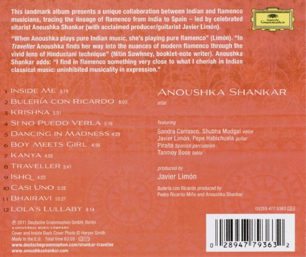 Audio CD (March 20, 2012) Number of Discs: 1 Label: Deutsche Grammophon Run Time: 3785 seconds ASIN: B0057ZEMF2 Average Customer Review: 4.3 out of 5 stars Release Date 2011 Duration 01:02:59 Genre International Pop/Rock Styles Indian Classical Indian Subcontinent Traditions Contemporary Flamenco Raga Western European Traditions Recording DateAugust, 2009 AllMusic Review by Mariano Prunes The daughter of Ravi Shankar and young prodigy of the sitar has long been a star of the world music circuit on her own, not merely due to her virtuoso credentials, but also for her willingness to explore the possibilities of the classical sitar within other musical genres and traditions. For her seventh album, Anoushka Shankar sets her sights on the links between Hindu and flamenco music, and -- almost logically -- turns to producer Javier Limón, arguably the key figure in the development of flamenco fusion in the past decade. Although her sitar playing remains the focal point of the album, Shankar is joined by superb musicians from both sides of the equation: Sandra Carrasco, Ramón Porrina, Álvaro Antona, Pepe Habichuela, Pedro Ricardo Miño, Pirashanna Thevarajah, Sanjeev Shankar, Padma Shankar, Shalini Patnaik, and Kenji Ota. Inevitably, the results are as intriguing as they are beautiful, one of the key world music releases of 2011. Anoushka Shankar: Traveller – review 4 / 5 stars (Deutsche Grammophon) Robin Denselow Thursday 13 October 2011 23.00 BST First published on Thursday 13 October 2011 23.00 BST It goes without saying that Anoushka Shankar is a virtuoso sitar player, but one can never be sure how she will use her skills. She has given some memorable performances in the past, playing ragas alongside her legendary father and teacher Ravi, but her solo work has edged towards the experimental and pop mainstream. Her Breathing Under Water album, recorded with electronica exponent Karsh Kale, included a ballad from Sting. Now comes a very different project, in which she explores the links between Indian music and Spanish flamenco, the result of ancient Gypsy migration. It's an area that has fascinated Nitin Sawhney – who provides the sleeve notes – and allows her to demonstrate her inspired instrumental work in the company of Indian musicians and the flamenco elite, including the producer and guitarist Javier Limón. The best tracks are those where Shankar takes chances, matching uninhibited sitar improvisation against flamenco percussion and the furious, inspired piano work of Pedro Ricardo Miño on the thrilling Buleria Con Ricardo, or backing the passionate singing of Duquende or more thoughtful Concha Buika. There are occasional less exciting, easygoing passages, including the title track, but this is a brave and original set.