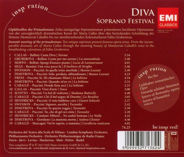 这张CD一共收录了十九首,二十世纪后半叶十位知名女高音演唱的咏嘆调。有义大利的抒情女高音安娜莫芙、美国的花腔女高音席尔丝、新一代的抒情女高音史温森、帕华洛帝的最佳搭档和同乡芙蕾妮、卡拉丝继承人史柯朵、美国黑人抒情女高音韩翠克丝等人。她们分别演唱了来自歌剧托丝卡、杜兰朵公主、乡间骑士、梦游女、赛维亚理髮师、波西米亚人等剧中的知名咏嘆调,盪气迴肠,绕樑三日不绝於耳。德国EMI的选曲,有著最高规格的审美标準和眼光。