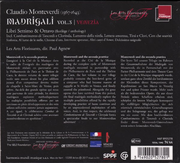 Recorded at the Cite de la Musique during the complete cycle of Monteverdi madrigals mounted in partnership with the Philharmonie de Paris and the Theatre de Caen, the last volume in our trilogy probably contains the best-loved gems of a composer who had become maestro di cappella at St Mark's in Venice, and finally entered the priesthood. Alongside the great operas that have survived from this period, the final madrigals methodically explore the multiple possibilities offered by the rapidly developing practice of basso continuo and by an unprecedented exploitation of solo voices. And, in that respect, the celebrated 'Combattimento di Tancredi e Clorinda' forms a spectacular finale to our Monteverdian adventure!