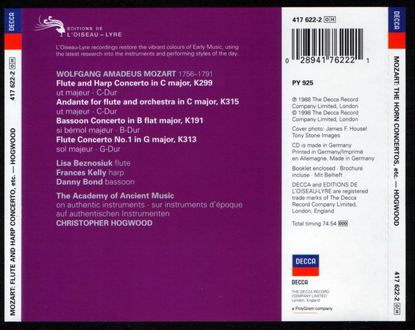 Christopher Hogwood -莫扎特:长笛与竖琴 大管和第一长笛协奏曲 Mozart-Concertos Flute Harp 299 Bassoo