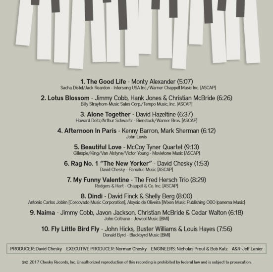 Experience the history of Jazz piano and feel the music come alive with this new piano compilation from Chesky Records that features iconic performers such as Monty Alexander, Shelly Berg, David Chesky, David Hazeltine, Fred Hersch, John Hicks, Hank Jones, McCoy Tyner, and Cedar Walton.