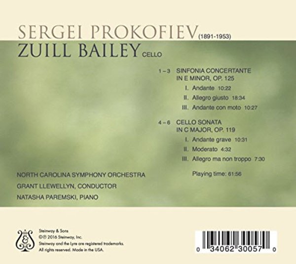 Cellist Zuill Bailey repeats almost exactly the formula that won raves from the critics in his 2014 Telarc recording of cello music by Benjamin Britten. That included the Symphony-Concerto and a Cello Sonata, as does this new Steinway disc of music by Sergei Prokofiev, due to be released on April 29, 2016. Bailey has the same supporting cast as well: the North Carolina Symphony conducted by Grant Llewellyn, and in the Sonata, pianist Natasha Paremski. The concerted works of both discs were recorded live at the Meymandi Concert Hall in Raleigh, while the sonatas come from the studio.