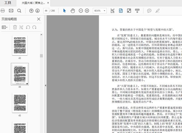 : 【上篇 大国难题】 第一章 中国经济的欧洲化 1. 欧洲正经历大考 2. 为什么大国梦如此迷人? 3. 大国的难题 4. 发展中大国的困境与机遇 5. 统一市场符合公共利益 第二章 在集聚中走向平衡 1. 三个有关空间的误解 2. 自由移民的意义 3. 空间的力量 : 3M 与3D 47 4. 城乡和区域发展中的要素流动和政策 第三章 打破大国发展的“不可能三角” 1. 政府与市场的边界 : 为城市化“立法” 2. 世界不是平的 3. 行政配置资源的方向与人口流向相悖 4. 以效率换均匀的代价 第四章 警惕“扭曲之手” 1. 区域发展的公平性原则 2. 何不土地和户籍制度联动改革? 3. 劳动力都去哪儿了? 4. 地方政府的产业政策之殇 5. 转变发展方式为何那么难? 【下篇 大城之解】 第五章 大城市不死 1. 大城市的生机 2. 包容性的就业创造 3. 活在城市,还是生活在城市? 4.“ 以业控人”是南辕北辙 5. 挑选劳动力技能的后果 第六章 全球视野下的大城市 1. 中国城市发展:全球趋势的又一例证 2. 国家规模与首位城市:国际视角 3. 巨型城市的人口:东京道路 4. 中国的巨型城市:以上海为例 第七章 城市化之辩 1. 城市化模式 : 事实胜于雄辩 2. 外来人口是负担还是财富? 3. 城市化会遭遇耕地瓶颈吗? 4. 拥挤的绿色城市 第八章 城市社会分割之困 1. 农民工留下青春和健康,带走自己 2. 歧视的原则 3. 户籍制约了消费 4. 为什么户籍不能成为身份? 5. 大城市的收入差距 6. 文化的融合将日益重要 第九章 向“城市病”宣战 1. 应对城市病的国际经验 2. 治理“城市病”:宜疏不宜堵 3. 集聚有利于污染减排 4. 贫民窟是“非典型性城市病” 5. 城市管控 : 对人,还是对行为? 结语 为了公共利益 写给未来的一封信 (代后记) 致谢