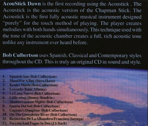 Bob says in his liner notes that the AcouStick is "the acoustic version of the Chapman Stick" and is "the first fully acoustic musical instrument designed purely for the touch method of playing", and that this CD is its "first recording".