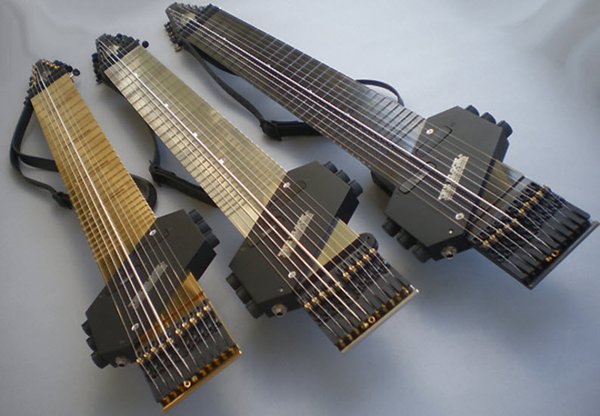 2 它的琴弦是由一组6弦的电吉他弦(EADGBE)和一组低8度的6弦电贝司反装弦组成,反EADGBE,5个8度的魔鬼音域,可作为普通的电吉他使用,也可以作为