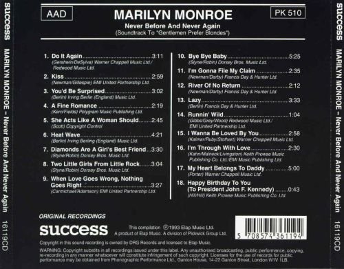 很少有人把玛丽莲·梦露看成一位歌手,尽管她在许多影片中都展示了她那独特迷人的嗓音。梦露并不是一位正规训练的歌手,而且她的许多歌曲也因此显得品质参差不齐,似乎唱好唱坏完全由她的心情而定。尽管如此,她那独特的嗓音却一直包含着她的魅力她的灵魂。这张1978年首版1990年再版的《Never Before and Never Again》是我最喜欢的一张梦露专辑,收录了梦露出演的电影中的歌曲,范围几乎涵盖了她的整个演艺生涯。像是《飞瀑欲潮 Niagara (1953)》中的“KISS”,《热情如火 Some Like It Hot (1959)》中的“I'm Through with Love”,《Lets Make Love (1960)》中的“My Heart Belongs to Daddy”,专辑还收录了1962年在纽约麦迪逊广场花园(Madison Square Garden)为美国总统John F. Kennedy献唱的那首“Happy Birthday”。不过最棒的要数电影《绅士爱美人 Gentlemen Prefer Blondes (1953)》中歌曲的完全收录:“Two Little Girls form Little Rock”、“Bye Bye Baby”、“When Love Goes Wrong, Nothing Goes Right”以及最经典的“Diamonds Are a Girl's Best Friend”。