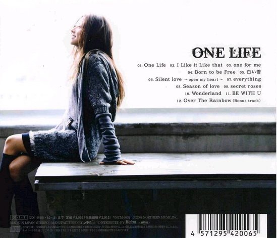 收录包含畅销单曲「Silent love~open my heart~/BE WITH U」「白い雪」「Season of love」、特别收录曲「Over The Rainbow」等共12首歌曲!!在日常生活中, 在人生旅途中, 每个人都有珍惜的东西, 应该守护的东西, 相信的东西。将这些聚集在一起取名为“ONE LIFE”, 仓木麻衣的新专辑决定於2008年1月1日发行!集结了25岁仓木麻衣的现在, 如同珠玉般的12首歌。这次制作的选曲, 除了有与自出道以来提供多首畅销歌曲的大野爱果、Yoko Blaqstone合作的作品之外, 还有丹麦出身的作曲家Martin Ankelius & Henrik Andersson-Tervald(主打歌「One Life」)、Radi8(「I Like it Like that」)、以“冬季恋歌”知名的韩国製作人유해준(Yoo Hae Joon)等人, 有多首第一次合作的作品! 日々の生活の中、人生を过ごしてゆく中、谁もが持っている大切なもの、守るべきもの、信じるもの。それらを集约した“ONE LIFE”をタイトルに冠した仓木麻衣のニューアルバムが2008年1月1日リリース决定!ヒットシングル「Silent love~open my heart~/BE WITH U」「白い雪」「Season of love」、Bonus track「Over The Rainbow」を含む全12曲収録! 今作の制作にあたりセレクトされた楽曲には、デビュー以来、数々のヒット作を生み出して来た大野爱果、Yoko Blaqstoneとのコラボ作品に加え、デンマーク出身の作曲家・Martin Ankelius & Henrik Andersson-Tervald(タイトル曲「One Life」)、Radi8(「I Like it Like that」)、“冬のソナタ”でも知られる韩国のヒット・メーカー・ユ・ヘジュンら、初コラボとなる作品も多数! 今作の制作にあたりセレクトされた楽曲には、デビュー以来数々のヒットを生み出してきた大野爱果、Yoko Blaqstoneとのコラボ作品に加え、デンマーク出身の作曲家・Martin Ankelius、Radi8、“冬のソナタ”でも知られる韩国のヒットメーカー、ユ・へジュンら、初コラボとなる作品も多数!R&B、SOUL、DANCE、HIP HOP、POPS…様々なサウンドテイストに溢れるバックトラックにのせた透き通ったヴォーカルが心地よいグルーヴを生み出した1stアルバム「delicious way」を更に进化させた1枚! 1年4ヶ月ぶりにリリースされるオリジナル・ニューアルバム。シングル曲「白い雪」「Seasons of love」、タイトル曲「ONE LOVE」を含む全11曲収録。ボーナストラックとして、「Over the rainbow」のアコースティック・ライブver.を収録。