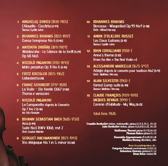 在他们的新专辑中,他们不止让我们眼花繚乱。这两个才华四溢的姐妹,虽在弦乐器上有不凡的造绎,却能静心坐在在钢琴上自由地铨释美好的曲目 - 比如勃拉姆斯的匈牙利舞曲中,帕格尼尼的 La Truitede Schubert 或 La Campanella - 但也是最近的专辑 “coup de coeur” 的作品。我们的两位音乐家因此踏上了由马修·赫尔佐格(Mathieu Herzog); Ensemble Appassionato的领导所编排的 “红色小提琴和阿甘正传” 那亲密和充满热情活力的原创曲目来一起合奏。