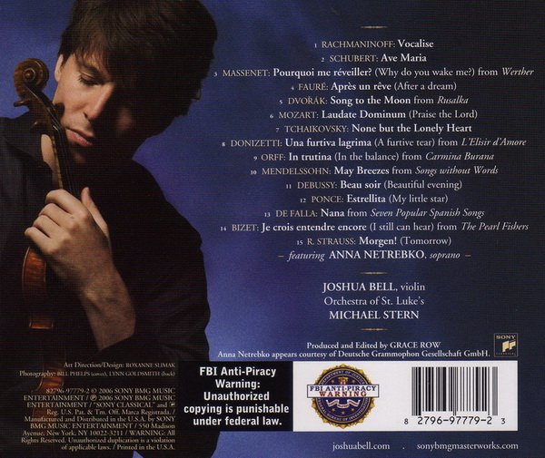 继【小提琴的爱情】之后,约夏贝尔精心挑选改编咏嘆调名曲,又一雋永动听之专辑约夏贝尔以一七一三年Gibson史特拉第瓦里名琴演绎拉赫曼尼诺夫《声乐练习曲》、舒伯特《圣母颂》、德弗札克歌剧【露莎卡】咏嘆调《月之颂》、董尼采第歌剧【爱情灵药】咏嘆调《情泪徒劳》在灌录过十九世纪所有重要的浪漫协奏曲录音后,以演奏电影原声带《红色小提琴》而声名大噪的小提琴家约夏.贝尔近几年来,找到了新一代小提琴家的定位,他明白在这个古典音乐人口消退、唱片购买力下降的年代,古典音乐的魅力需要用新的观点去设定。继2003年专辑【小提琴的爱情Romance of the Violin】在排行榜与销售量上交出一张漂亮的成绩单之后,约夏贝尔再次亲自精心挑选歌剧咏叹调以及艺术歌曲,将他们重新编写成适合由小提琴演奏的乐曲,希望藉此让更多人认识小提琴的另外一种风貌。