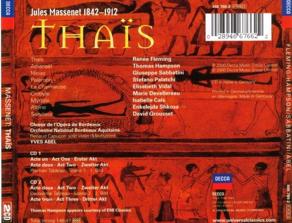 也许大多数人都并不熟悉马斯奈,不熟悉泰伊思,笔者也是的,基本对这些没什么了解.既然这样,我们依然从大家所知道的沉思曲说起.《Meditation Religieuse》也就是了,为马斯奈的歌剧《Thais》第二幕第一场与第二场中间所奏的间奏曲,故又称为《泰伊思冥想曲》,常被单独演奏,成为小提琴独奏曲中经久不衰的名篇,也是马斯奈的代表作品。作为一首不衰的名曲,被翻录,改编应该是不足为怪的, 也因此有更多人了解到Thais,了解到Massenet.这个版本由Renee Fleming饰演Thais,由Yves Abel指挥,期间客串了沉思曲的小提琴演奏.