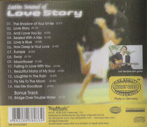 浪漫如诗的演奏 迷死人的轻柔情歌 Lex Vandyke 《拉丁爱情故事》 浪漫如诗的吉他演奏 ,清澈饱满的录音效果,最佳的后製过程,最顶级的压片水准,堪称吉他录音中的绝世经典!收录《The Shadow of Your Smile》、《And I Love You So》、《Fly Me To The Moon》与 Bonus Track「赛门与葛芬柯」经典名曲《Bridge Over Trouble Water》等迷死人的轻柔情歌! 拉丁吉他圣手 Lex Vandyke 继「拉丁情迷」、「情陷地中海」、「情迷夜上海」以及「情迷夜巴黎」等多张广受音响迷欢迎的专辑之后又一最新力作,以精湛的吉他演奏詮释十五首爵士与流行经典情歌。 浪漫如诗的吉他演奏 ,清澈饱满的录音效果,最佳的后製过程,最顶级的压片水准,堪称吉他录音中的绝世经典!收录《The Shadow of Your Smile》、《And I Love You So》、《Fly Me To The Moon》与 Bonus Track「赛门与葛芬柯」经典名曲《Bridge Over Trouble Water》等迷死人的轻柔情歌! Top Music 的老闆陈波儿(Povee Chen)亲自以INCRECABLE技术,32 Bits / 192 kHz 高解析度母带处理,全程採用 Hi End 级 Isoclean 电源处理,呈现出最顶级的清晰效果! 採用音质效果最好的「黄金合金」光碟(Alloy Gold CD)在德国的 Sonopress 压片,力求最完美的重播水准! 在 Top Music 推出一系列精彩的吉他演奏专辑的拉丁吉他大师 Lex Vandyke 最善于将悦耳动听的旋律化为舒服畅快的吉他演奏,2004 年「情陷地中海」专辑以优美的拉丁曲风及杰出的录音效果,一举获得当年「年度十大发烧唱片」殊荣,接下来的「拉丁情迷」、「情迷夜上海」与「情迷夜巴黎」等专辑,延续同样的拉丁风味与高品质製作,再次掳获最严苛的音响迷的耳朵。此次 Lex Vandyke 再度精挑细选多首爵士与流行领域的浪漫情歌,经过他的巧手改编,每首曲子结合音乐性和亲和力,以吉他为主,搭配轻柔的打击乐器,让人在熟悉的旋律中慢慢溶化,沉浸陶醉其中。无论是经典的西洋老歌如『Love Story』、『Sealed With A Kiss』、『Kiss Me Boodbye』几乎每一首曲子都能唤醒您一些美好回忆,而又同时能够享受著全新的聆听经验。 以提供音响迷最发烧的唱片为职志的 Top Music,再度展现出强烈的企图心,老闆陈波儿(Povee Chen)亲自担纲母带处理的工作,以最 Hi End 的精神製作并採用音质效果最好的「黄金合金」光碟(Alloy Gold CD)在德国 Sonopress 压片,呈现出无比清晰的录音效果,吉他充满饱满的颗粒感与立体感,中、低频浑厚圆润,气韵生动且充满轻鬆悠閒的感受,浪漫的气氛洋溢在整个空间之中。无论您是随性享受熟悉的音乐,或者是刻意调校测试您的音响系统,这张『拉丁情歌』一定会是您经常想要拿出来播放的片子。