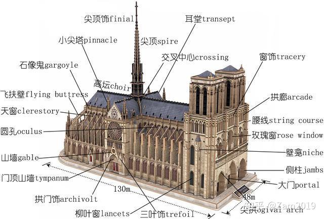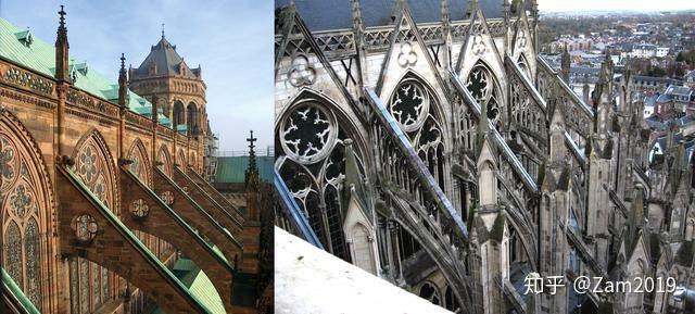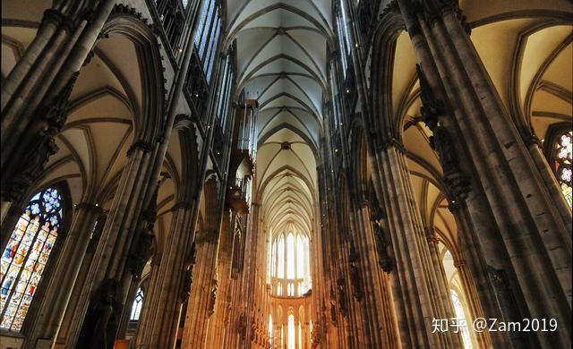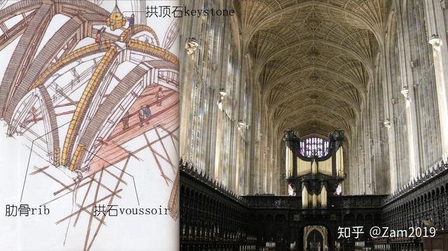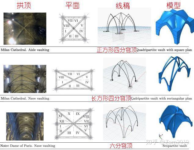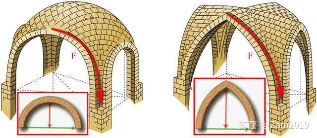 十字拱顶也叫穹棱拱顶或棱拱,棱拱其实是由最简单的筒拱发展而来,两个筒形拱顶相交便成十字拱顶;十字拱顶的过人之处,是能把拱顶压力发散到四面墩柱上,这与三角穹顶有异曲同工之妙。而相交处便成为肋架,肋架随着发展,又变成哥特式最重要的特征——尖肋拱。