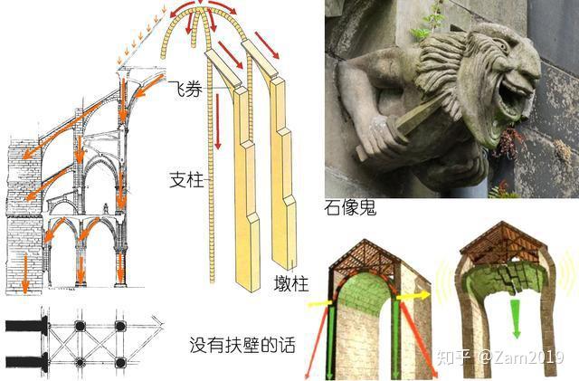 帆拱/Pendentive,也叫三角拱,它的出现是建筑史上一个重要转折点,自此以后,人类就能把圆顶建在方形基座上,既将建筑力学探索到一个全新层次,又把建筑美学表现得淋漓尽致!和叠涩拱或内角拱砌成的圆顶不同,它主要是依靠穹隅来支撑圆顶,故又叫三角穹顶;此外,帆拱主要采用砖块建造,这也比古罗马单纯使用混凝土建造的圆顶有所进步。