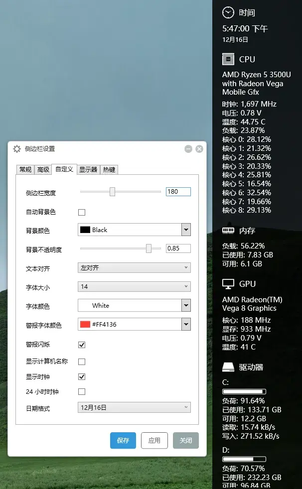 • 功能:一款运行在 Windows 桌面侧边栏的硬件监控工具,用于实时显示电脑的各项运行状态。可监控 CPU、内存、GPU、网络以及逻辑磁盘等硬件信息,并为所有指标生成动态曲线图。支持高度自定义显示内容与样式,可为关键数值设置告警提醒,支持快捷键绑定,兼容不同 DPI 的显示器,侧边栏顶部还内置时钟,方便随时查看系统状态。