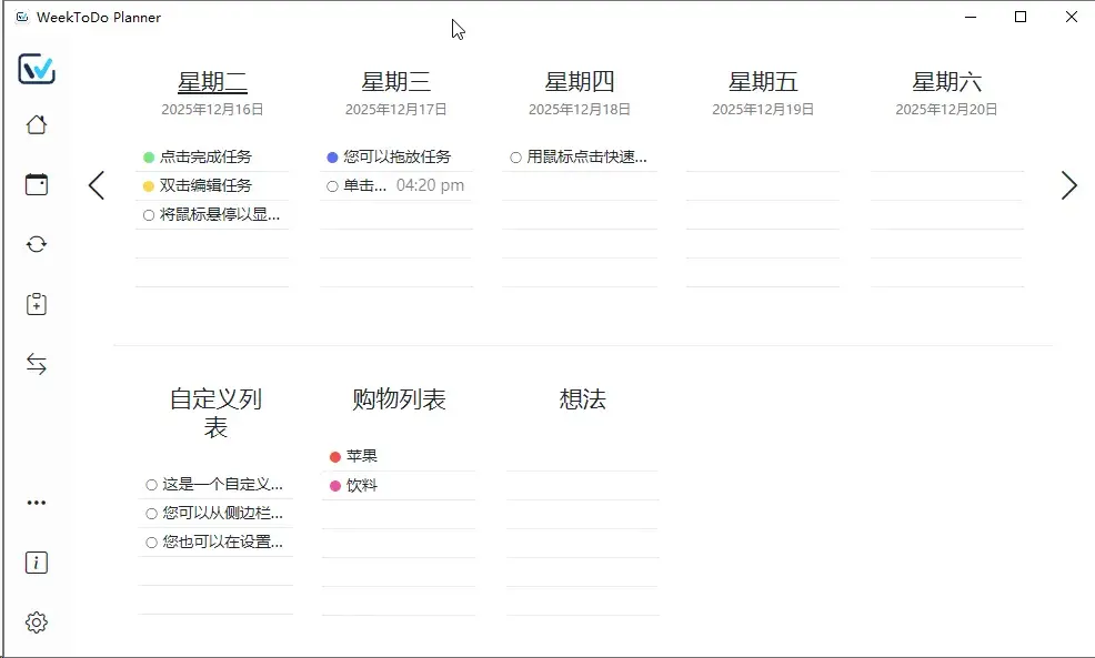 • 功能:一款免费开源的极简周计划工具,将日历与任务清单融合在同一界面,帮助你围绕“本周重点”来安排时间与任务。支持任务提醒、颜色标记、重复任务与子任务设置,操作直观、上手简单,适合按周规划学习与工作节奏。所有数据均保存在本地设备中,注重隐私安全。支持多语言,可作为原生应用运行,也可直接通过浏览器使用。