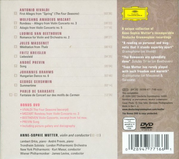 德国DG公司出品2007年10月发行《纪念穆特正式首演30周年精选集》 本专辑是由DG公司2007年10月发行的《纪念穆特正式首演30周年精选集》CD+DVD特别版,汇集了穆特首演30周年来演奏 的最经典的曲目,可谓经典中的经典。其发烧效果和可听性,是发烧友试机、收藏之上品。本次上传为特别版中的CD。
