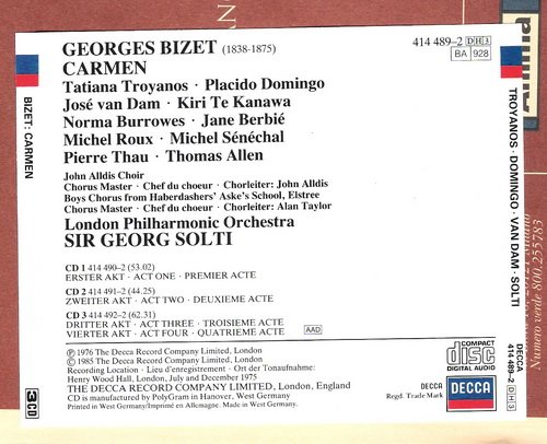 索尔蒂与伦敦爱乐于1975年录音 企鹅三星 恐怕不怎么喜欢音乐的人也知道比才的《卡门》。起码听到过《卡门》的某些段落 ,“序曲”、“哈巴涅拉”、“斗牛士之歌”等等。《卡门》称得上是所有歌剧中最引人入胜的一部。它的音乐朗朗动听,多姿多彩,并且始终充满着活力,火热,泼辣,诱人。二重唱“花之歌”可谓一往情深,缠绵而甜美,甚至卡门唱的那些耍赖,撒野的曲调也都迷人极了。 时至今日,「卡门」已成为音乐史上最受欢迎、演出次数最多的法国歌剧,而作曲家比才为全剧创作的多首音乐,更是已成为脍炙人口的传世经典。大师索尔蒂与伦敦爱乐于1975年录制的本录音,统合了男高音多明戈、女高音卡纳娃、次女高音特罗扬诺斯与男中音范·丹姆等多位出色歌唱家,再加上录音大师Wilkinson亲手掌盘,与Colin Moorfoot七六年联手在少见的Herny Wood Hall合作录音,创造出非常惊人的音响效果。不论就演译或录音等各方面来看,均无愧为无比豪华坚强的阵容。并被誉为最有魅力的卡门之一。企鹅指南三颗星,歌剧唱片百科全书(英国火蜥蜴出版)最佳推荐。