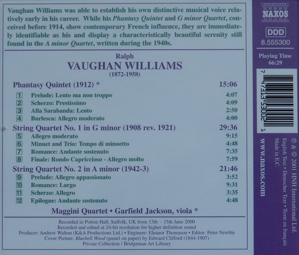 收录沃恩威廉斯的幻想五重奏(1-4)和两首四重奏(No.1 5-8 /No.2 9-12)。其中幻想五重奏旋律优美,也很耐听;后面那两首四重奏就需要有点古典修为了--一点而已,沃恩威廉斯玩的并不是玩无调音乐。