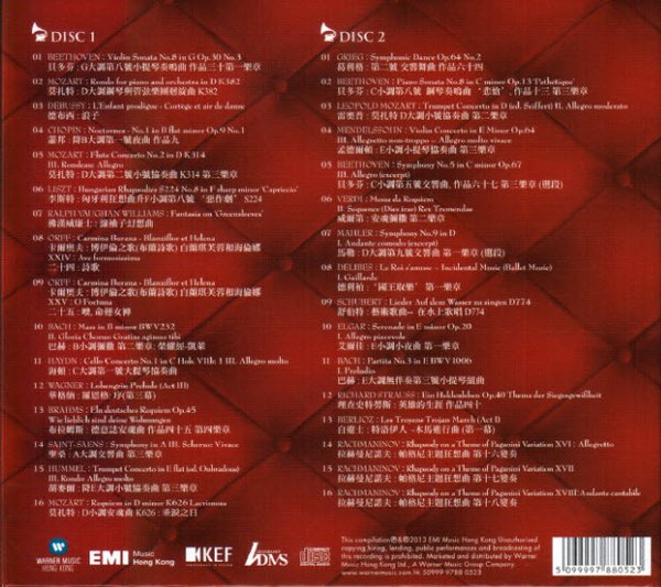 : CD 1 01. Beethoven: Violin Sonata No.8 in G Op.30 No.3 02. Mozart: Rondo for piano and orchestra in D 03. Debussy: L’Enfant prodigue Cortège et air de danse 04. Chopin: Nocturnes No.1 in B flat minor Op.9 No.1 05. Mozart: Flute Concerto No.2 in D 06. Liszt: Hungarian Rhapsodies No.8 in F sharp minor 'Capriccio' 07. Vaughan Williams: Fantasia on 'Greensleeves' 08. Orff: Carmina Burana - Blanziflor et Helena – Ave Formosissima 09. Orff: Carmina Burana - Blanziflor et Helena - O Fortuna 10. Bach: Mass in B minor 11. Haydn: Cello Concerto No.1 in C 12. Wagner: Lohengrin - Prelude 13. Brahms: Ein deutsches Requiem 14. Saint-Saens: Symphony in A 15. Hummel: Trumpet Concerto in E flat 16. Mozart: Requiem in D minor CD 2 01. Grieg: Symphonic Dance Op.64 No.2 02. Beethoven: Piano Sonata No.8 in C minor 'Pathétique' 03. Leopold Mozart: Trumpet Concerto in D 04. Mendelssohn: Violin Concerto in E Minor 05. Beethoven: Symphony No.5 in C minor Op.67 06. Verdi: Messa da Requiem 07. Mahler: Symphony No.9 in D 08. Delibes: Le Roi s'amuse 09. Schubert: Lieder 10. Elgar: Serenade in E minor 11. Bach: Partita No.3 in E 12. Richard Strauss: Ein Heldenleben Op.40 13. Berlioz: Les Troyens 14. Rachmaninov: Rhapsody on a Theme of Paganini XVI: Allegretto 15. Rachmaninov: Rhapsody on a Theme of Paganini XVII 16. Rachmaninov: Rhapsody on a Theme of Paganini XVIII: Andante Cantabile