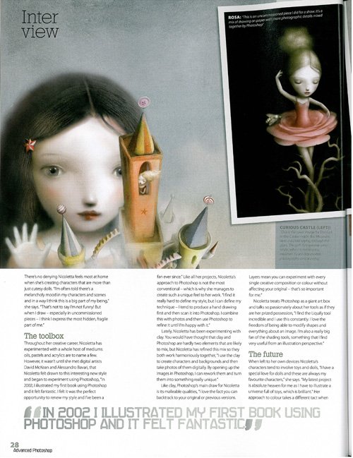 http://www.advancedphotoshop.co.uk/ Advanced Photoshop is the perfect magazine for honing already great Photoshop skills, and learning new advanced techniques for the world’s best image-editing software. Each issue is packed with inspiring interviews, challenging tutorials and the whole magazine is tailor-made for the advanced digital artist. 31 辑主要内容: ·技术 最新最好的技术 - 使用 CS3 智能滤镜 - 掌握专业的拼接全景方法 - 编辑新相机中未加工过的图像 ·创作指南 富有挑战性与启示性的大师班 - 从相片创造地球 - 设计流行艺术片断 ·精选 - 如何举办展览 - 如何在 PhotoShop 找到你的独特风格 - 与 Nicoletta Ceccoli 的专访 Issue 31 Techniques The latest and greatest techniques; - Work with CS3’s Smart Filters - Master a professional Photorealism style - Edit JPEGs and TIFFs in the new Camera Raw Creative Tutorials Challenging & inspiring Masterclasses including; - Create globes from photos - Design a piece of Pop art Also featured; - How to put on an exhibition - How to find your unique Photoshop style - Interview with Nicoletta Ceccoli
