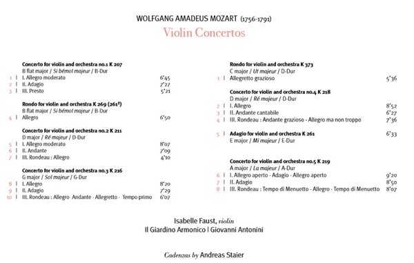 凭藉首张音乐专辑, 随即获得古典杂誌《留声机》「年度青年演奏家」的肯定, 多年来小提琴家 Isabelle Faust 精湛的演奏实力, 获得国际间的好评盛讚。2016 年适逢莫札特诞辰 260 周年所推出的《小提琴协奏曲》, 特别收录多部选自莫札特於年轻时完成的天才之作, 充分体现她精準俐落的卓越琴技, 与义大利指挥家 Giovanni Antonini 以及古典乐团 Il Giardino Armonico 彼此间的首度合作, 亦是一大瞩目焦点。