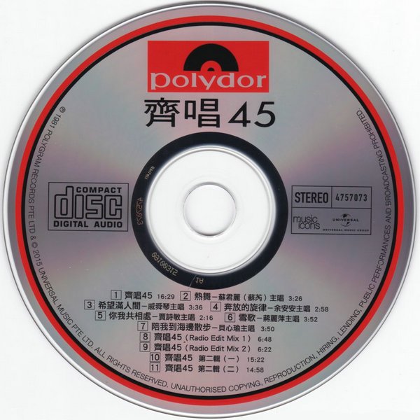 : 01. 齐唱45 唱/姑娘十八一朵花/永远的微笑/意难忘/康定情歌/ 月圆花好/夜来香/苏州河边/如果没有你/月光小夜曲/ 南屏晚钟/相思河畔/香格里拉/今宵多珍重/高山青/唱/ 春风吻上我的脸/月儿弯弯照九州/秋的怀念/凤凰于飞/ 小小羊儿要回家/我的心里没有他/第二春/峇厘岛/ 午夜香吻/梭罗河/岷江夜曲/绿岛小夜曲/天上人间/ 秋水伊人/玫瑰玫瑰我爱你/江水向东流/夜上海/唱 02. 热舞 - 苏君丽(苏芮) 03. 希望满人间 - 戚舜琴 04. 奔放的旋律 - 余安安 05. 你我共相处 - 贾诗敏 06. 雪歌 - 蒋丽萍 07. 陪我到海边散步 - 贝心瑜 08. 齐唱45(Radio Edit Mix 1) 09. 齐唱45(Radio Edit Mix 2) 10. 齐唱45 第二辑(一) 欢唱/今天不回家/往事只能回味/心爱的马车/ 泪的衣裳/问白云/昨夜梦醒时/四个愿望/情人梦/ 风从哪里来/不得了/可爱的人生/小小水仙花/ 花儿像人人像花/娜奴娃情歌/轻烟/陪我去买菜/ 又像细雨又像风/欢唱/生命如花篮/只要为你活一天/ 向日葵/像雾又像花/泪的小花/我找到自己/谁敢相信你/ 情人的阳光/因为我爱你/人生一条路/有我就有你/ 我在你左右/路边野花不要采/爱你一万倍/风狂雨又大/ 街灯下/情难守/欢唱 11. 齐唱45 第二辑(二) 曼莉/苦酒满杯/白云/破碎的心/往日的旧梦/三个梦/ 牧童之歌/夜茫茫/为了你/亚兰娜/再会吧!叮噹/ 亲爱的巴比多/想你想你/爱他爱他/田园之歌/甜蜜的梦/ 苹果花/提醒你/相思苦/天边一颗星/我没有人爱/ 一叶浮萍/寻梦园/可爱的马/今夜雨蒙蒙/无情火车/ 爱的苦酒/我已经早回头/泪痕/负心的人/苦情花/秋词/ 梅兰梅兰
