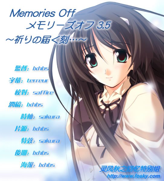 首先献上秋之回忆3.5 传达祈愿的时刻,为之前灵风版本的重新校对修正版,加入了更多的细节处理,内嵌了OP和ED的卡拉歌词特效,外挂了简繁双字幕。