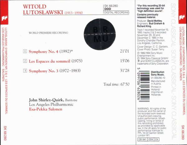 Lutoslawski 卢托斯拉夫斯基 -第四和第三交响曲 Symphonies Nos. 3 4 Shirley-Quirk Salonen SONY[F