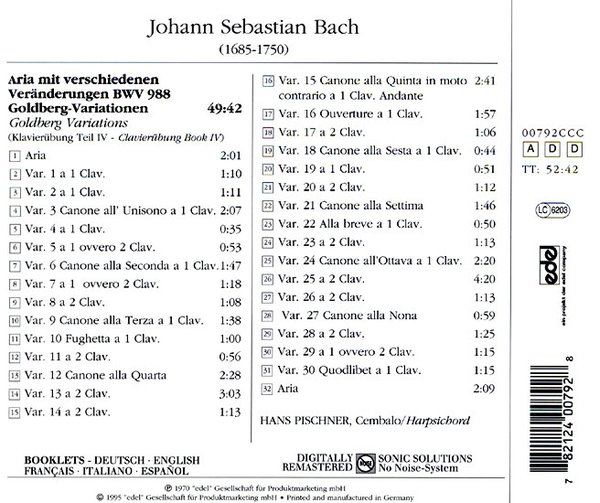 : 01. Aria 02. Variation 1 a 1 Clav. 03. Variation 2 a 1 Clav. 04. Variation 3 Canone all'Unisono a 1 Clav. 05. Variation 4 a 1 Clav. 06. Variation 5 a 1 ovvero 2 Clav. 07. Variation 6 Canone alla Seconda a 1 Clav. 08. Variation 7 a 1 ovvero 2 Clav. 09. Variation 8 a 2 Clav. 10. Variation 9 Canone alla Terza a 1 Clav. 11. Variation 10 Fughetta a 1 Clav. 12. Variation 11 a 2 Clav. 13. Variation 12 Canone alla Quinta 14. Variation 13 a 2 Clav. 15. Variation 14 a 2 Clav. 16. Variation 15 Canone alla Quinta in moto contrario a 1 Clav. Andante 17. Variation 16 Ouverture a 1 Clav. 18. Variation 17 a 2 Clav. 19. Variation 18 Canone alla Sesta a 1 Clav. 20. Variation 19 a 1 Clav. 21. Variation 20 a 2 Clav. 22. Variation 21 Canone alla Settima 23. Variation 22 Alla breve a 1 Clav. 24. Variation 23 a 2 Clav. 25. Variation 24 Canone all'Ottava a 1 Clav. 26. Variation 25 a 2 Clav. 27. Variation 26 a 2 Clav. 28. Variation 27 Canone alla Nona 29. Variation 28 a 2 Clav. 30. Variation 29 a 1 ovvero 2 Clav. 31. Variation 30 Quodlibet a 1 Clav. 32. Aria
