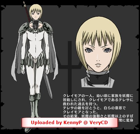 组织中的黑衣人之一,古妮雅的代理人。是故事中主要的情报提供者,而且年龄成谜,动机也是一团谜。 有待完善…… 【官方网站】 http://www.ntv.co.jp/ http://www.j-claymore.com/ http://www.vap.co.jp/claymore/ 【STAFF】 原作:八木教广 导演:田中洋之 系列构成:小林靖子 人设:梅原隆弘 动画制作:MADHOUSE 【CAST】 CLAY:桑岛法子 TERESA::朴璐美