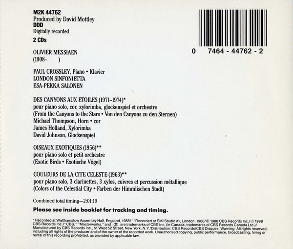 《异国鸟》为钢琴独奏及管弦乐而作(1956),它描绘了世界各国及不同栖息地的约40种鸟。这些鸟各种奇异、独特的鸣叫声,如同它们绚丽多彩的羽毛颜色一样。全曲可分十三个段落: