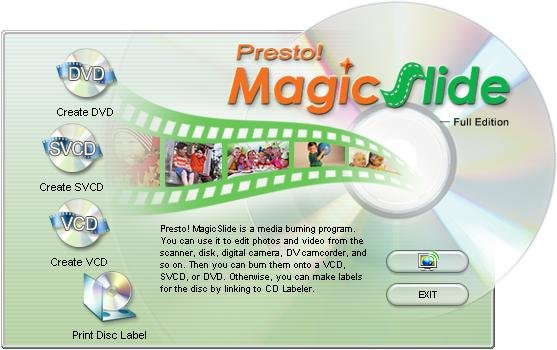 http://www.newsoftinc.com/products/productimages/digitalvideo/12_create3.jpg Once you have created the album you want to share with your friends or family, Presto! MagicSlide makes it simple for you to either send it in an email or burn it on a DVD, SVCD or VCD. You can create a DVD-R, DVD-RW, DVD+R, or DVD+RW disc with your slide shows and movies that can be played on a DVD player. A DVD can have up to 99 slide show chapters and each slide show can include nearly 10,000 photos. Or, create a CD-R or CD-RW disc with your slide shows and movies that can be played on a VCD player or on standard DVD players that support CD-R and CD-RW discs. And, with MagicSlide's unique CD labeling functionality, you can directly pass the Menu Title and other title names directly to the CD label. http://www.newsoftinc.com/products/productimages/digitalvideo/ms_function.gif