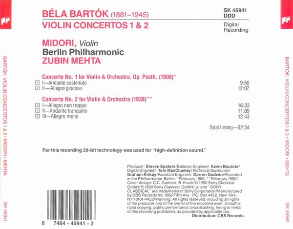 Bela Bartok -巴托克:两首小提琴协奏曲 Violin Concertos 1 2 Midori Mehta BPO SONY[APE]
