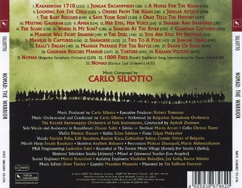 : 01. Kazakhstan 1710 2:55 02. Jungar Encampment 0:58 03. A Horse For The Khan 1:45 04. Looking For The Child 1:34 05. Orders From The Khan 1:18 06. Jungar Attack 2:14 07. The Baby Rescued 1:08 08. Save Your Son! 3:20 09. Oraz Tells The History 2:46 10. Meeting Gaukhar 1:31 11. Amen 1:54 12. Her Eyes, Her Voice 1:16 13. Sharish And Shangrek 0:30 14. The Scarf 1:38 15. Where Is My Son 1:39 16. Sharish At The River 1:02 17. Gaukhar Captured 1:43 18. Mansur Will Fight Sharish 0:49 19. The Duel 3:16 20. You Are Still My Brother 3:12 21. Mansur Is Captured 1:56 22. Shangrek 2:02 23. Tied To A Pole 0:43 24. Jungar Trials 1:42 25. Erali's Dream 0:45 26. Mansur Prepares For The Battle 0:49 27. Death Of Erali 4:00 28. Gaukhar Rescues Mansur 5:07 29. Torture 1:48 30. Kazakh Victory 6:53 31. Nomad 2:34 32. 1000 Fires 1:49 33. Nomad Reprise 4:34