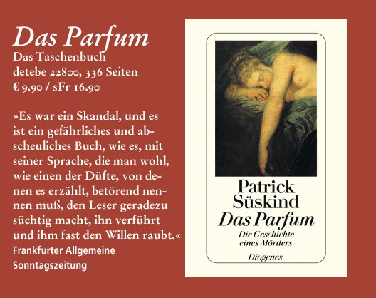 在他眾多的经典作品中,最为人称道的便是一九八五年出版的《香水》,这本以嗅觉为主题的长篇小说,在德国甫出版便卖出四十万册,并连续九年登上德国《明镜周刊》畅销书排行榜,更风靡了全世界,被翻译成四十二种语文版本,全球销量已逾一千五百万册,迄今仍是最畅销的文学作品之一!《香水》同时已被改编拍成电影,由『罗拉快跑』国际名导演执导,影帝达斯汀·霍夫曼主演,是德国电影史上斥资最巨的作品。